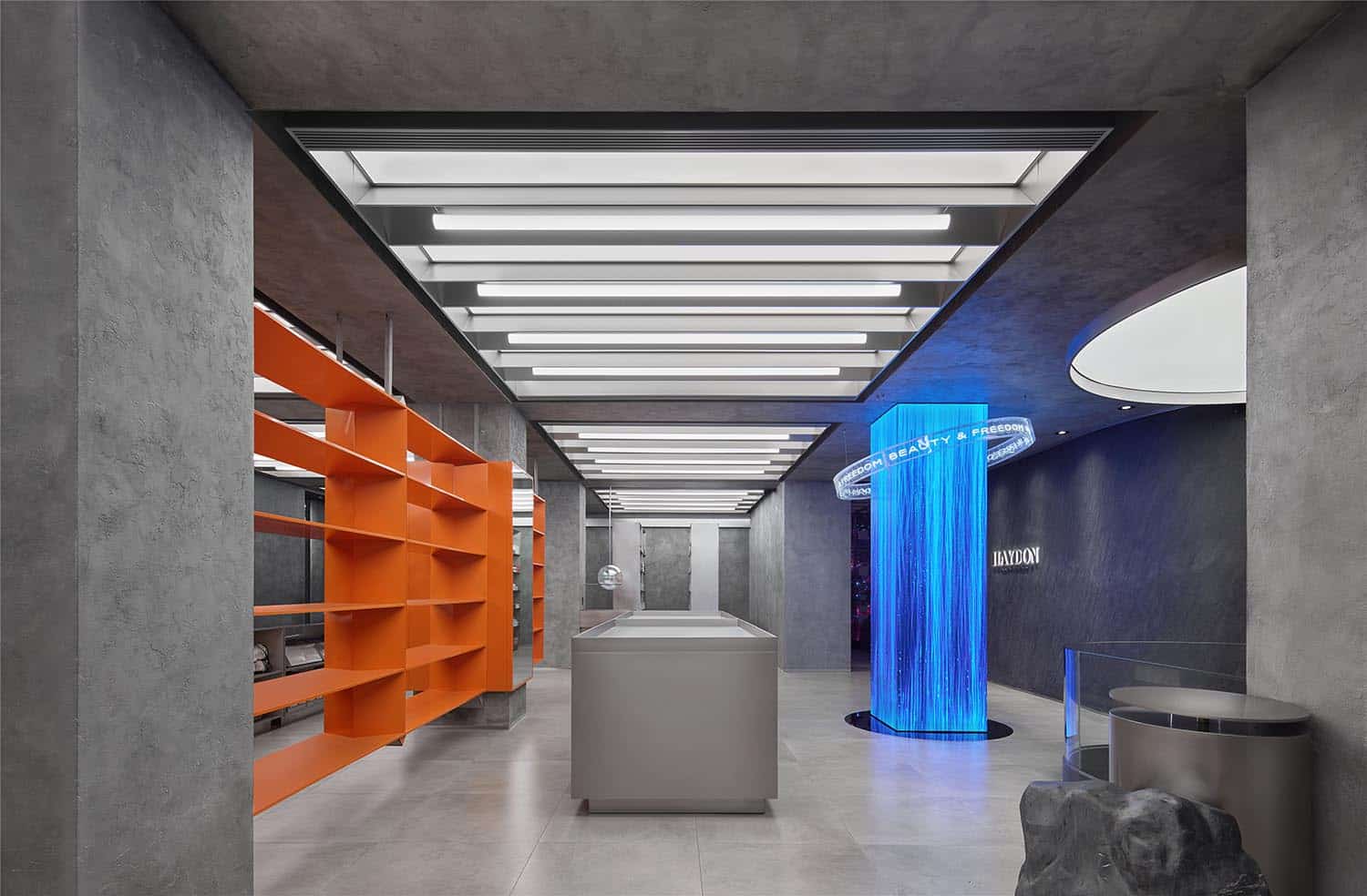 Las dos compañías han instaurado dentro de sus tiendas una sensación premium, minimalista y brutalista. Desde la entrada, pasando por sus pasillos, hasta la última planta, la mezcla de conceptos baña cada decisión del diseño. La diferencia está en que Haydon comunica su mensaje de una forma más elegante y orgánica que la de su competencia. Los asientos escultóricos, los juegos de luces —que imitan la Vía Láctea— y los matices de color flúor ponen el acento en este gris paisaje.