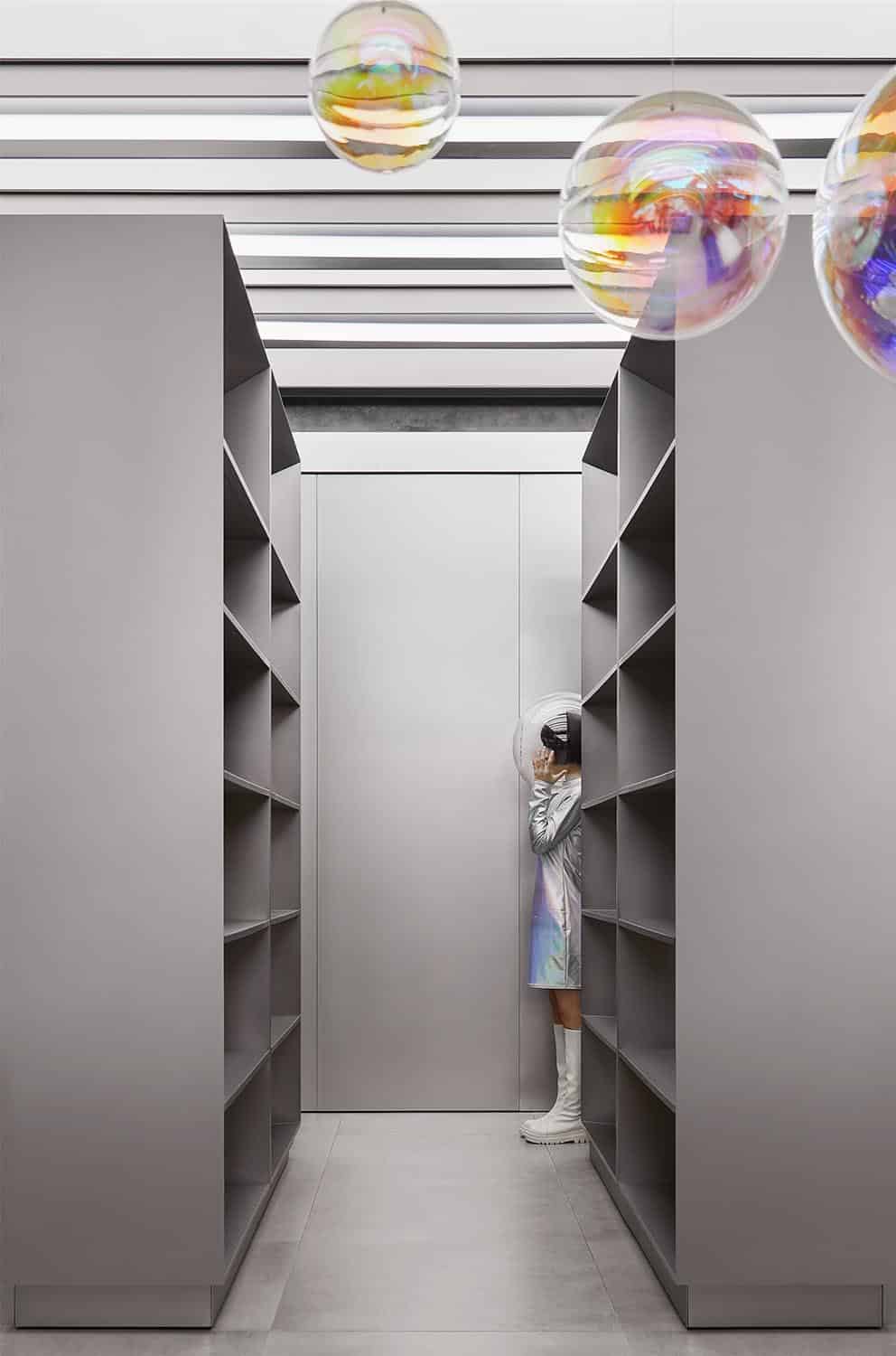 Cremas de Armani, Valentino o Dolce & Gabbana permanecen protegidas por muros robustos combinados con grandes estructuras blancas y plateadas. La iluminación, también blanca, pronuncia aún más el aspecto frío y misterioso del ambiente.