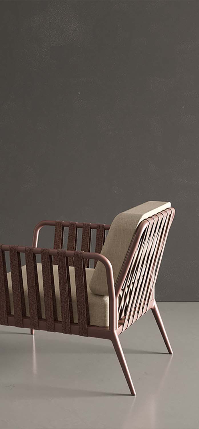 Conformada por butacas, sofás —modulares y completos— divanes, sillones, pufs y también mesas, la morfología de sus piezas sedentes busca impregnar de calidez el frío aluminio con una serie de cintas textiles en laterales y parte trasera, generando una urdimbre vertical que contrasta con la horizontalidad de los paisajes. Una serie caracterizada por la amplia variedad cromática, con la que Möwee consigue hacernos sentir la comodidad indoors en el jardín de nuestra casa.