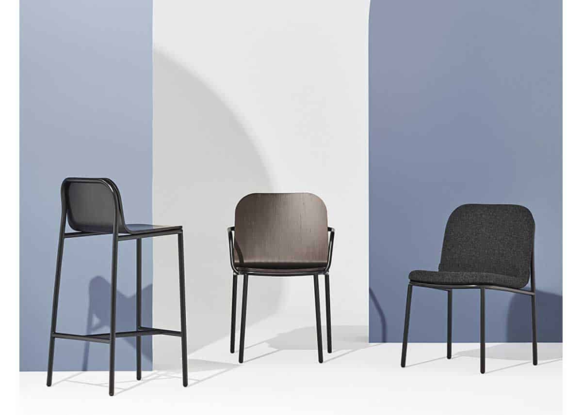 Tanto la plancha de una sola pieza que constituye el asiento y el respaldo de la versión en madera como la estructura tubular que la sujeta. Dentro del conjunto vemos variables que se convierten en taburete o sillón. Sus formas son de una familiaridad reconfortante, la mezcla justa entre practicidad y elegancia, como si fuera el resultado de la fusión entre una silla de colegio y una de Jean Prouvé.