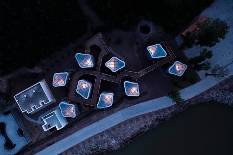Studio Avoid manipula el concepto de cueva vertical —tradicionalmente excavada hacia abajo que evoluciona hasta convertirse en un refugio sobre la rasante — y lo aborda mediante una serie de piezas repartidas sobre una pequeña extensión de terreno, suficiente como para albergar los usos ideados para los aldeanos: comer, descansar o vender mercancía.