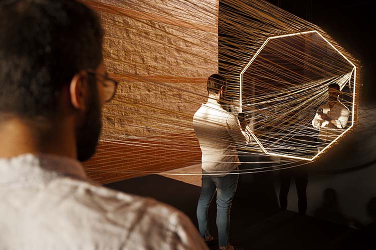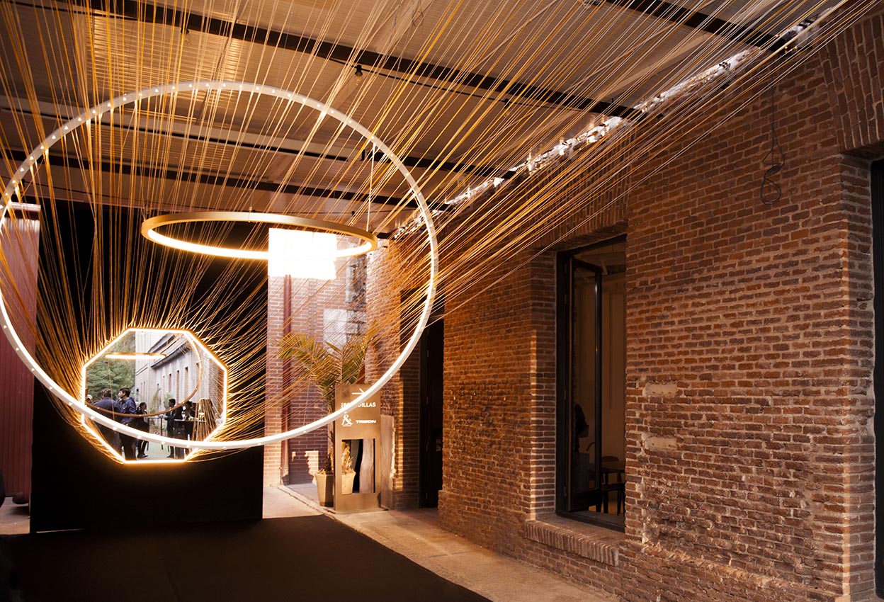 La Real Fábrica de Tapices es el referente de esta instalación capaz de envolver a todos en su misteriosa luz hilandera. En alusión a los telares, cientos de hilos de seda anudados a mano conectan entre sí tres luminarias de Viabizzuno de diferentes tamaños y formas, sabiamente colocadas conformando una composición perfecta. El túnel de hilos resultante, junto con la irreal suspensión de las lámparas circulares, ofrece infinitas perspectivas y enfoques, creando imágenes de una gran fotogenia. El espejo octogonal, colocado a media altura, refleja al espectador y la obra, capturándolos a ambos en un espacio imaginario que no es otro que el real.