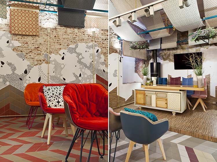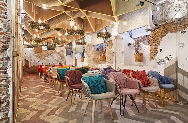 En esta reforma, Izaskun no hizo tabula rasa, alicatando hasta el techo o pintando todo de blanco. Muy al contrario, jugueteó con la memoria del lugar. Reunió nuevos materiales, como los paneles acústicos de madera microperforada de la firma española de soluciones de madera Finsa, junto a otros que ya conformaban el espacio, para que lo existente nos susurrara al oído las historias que ha vivido. De esta manera, al entrar en el auditorio, no veíamos sólo la época de la rehabilitación, sino las diversas capas de historia que se han ido aplicando a cada paramento. Chinchilla tomó, además, la provisionalidad de la reforma como símbolo de la libertad del diseñador para re-imaginar nuestro día a día. Así, combinó tanto macetas como muebles usados o nuevas telas estampadas, haciéndonos sentir espectadores del instante único en el que conviven materiales de tan diferente obsolescencia.