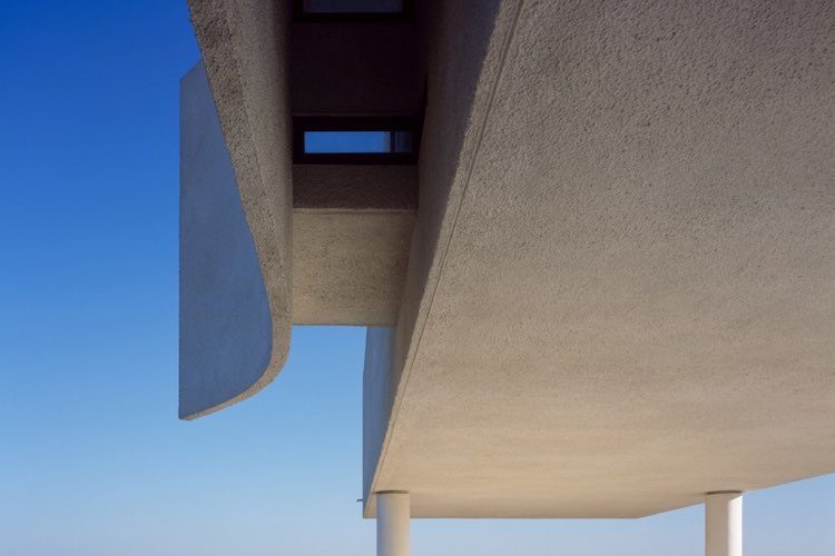 Es de alguna manera como una pieza arquitectónica que se asemeja a un viejo barco a la deriva y que aparece en la orilla. El edificio cuenta con un techo empinado, vidrieras ocultas y un generoso balcón con vistas al océano. El acceso es por una gran escalera que además de servir como forma de ritual, hace de zona de descanso informal y te sumerge en un espacio de tranquilidad con el estuco texturizado que cubre toda la fachada.