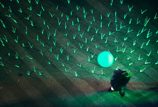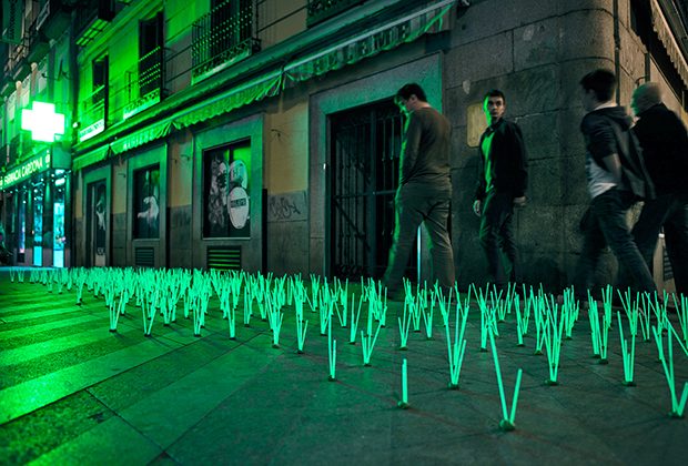 En su vida diurna, los dos componentes de Luzinterruptus se dedican a la fotografía, al arte y la iluminación. Se encuentran al menos una vez por semana y conciertan acciones clandestinas de acuerdo con las escenas que les sugiere Madrid. Sus ideas nacen de manera espontánea. “A veces salimos con nuestro carrito de luces por la ciudad sin rumbo fijo, a la búsqueda de instalaciones que otros ciudadanos construyeron anónimamente y que en ese momento nos inspiran y sentimos especialmente artísticas o reivindicativas”. Nacido en 2008, el grupo se caracteriza por “poner un punto de atención luminoso a problemas que detectamos en la ciudad y que parecen pasar desapercibidos a las autoridades o los ciudadanos”. Rituales anodinos como la recogida de la basura con bolsas de residuos iluminadas desde dentro. O la excesiva contaminación lumínica que escenifican, por ejemplo, con la pieza Malas hierbas mutantes. Humor crítico frente al invasivo “verde antinatural” de los rótulos de farmacia, cuyo impacto, nos cuentan, “creará en un futuro no muy lejano una nueva especie vegetal alimentada por la fotosíntesis de esa potente luz de bajo consumo”.