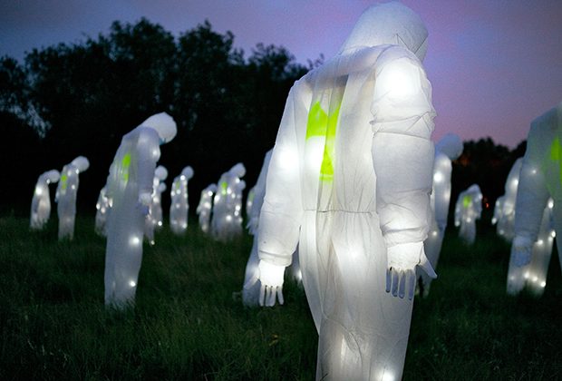 Con poco presupuesto para sus obras, el colectivo se explaya en festivales donde se les ofrece un caché cerrado y la oportunidad de crear instalaciones más ambiciosas, tanto en contenido como en materiales. Así nació Control Radiactivo. Realizado para el Dockville Festival de Hamburgo en agosto del año pasado, se trata de una visión poética del pánico tras el escape nuclear de Fukushima. Para la ocasión, convocaron un misterioso ejército de cien figuras cubiertas por monos y mascarillas anti-radiación. El objetivo: despertar en el público una reflexión sobre las consecuencias reales de una catástrofe nuclear. Sin textos, sin música, con la única partitura de unas formas anónimos iluminadas en medio de un descampado. Este mes de junio presentarán dos nuevos trabajos. Uno en el Gewerbemuseum de Winterthur, y otro en el Festival Light in Winter de Melbourne.