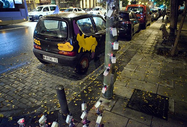 Madrid, noche cerrada. Todos los vehículos aparcados en una calle de Malasaña tienen una sirena de policía en su techo. El azul en movimiento giratorio se refleja en las fachadas como si de un estado de emergencia se tratara. ¿Han vuelto a sitiar el barrio las fuerzas del orden? No. Solo estamos ante una intervención realizada por el colectivo madrileño de arte urbano Luzinterruptus. Un vocablo mitad castellano y mitad latín para preservar la identidad de tres creadores anónimos que pretenden “dejar luces encendidas por la ciudad con la intención de que otros nos las apaguen”.