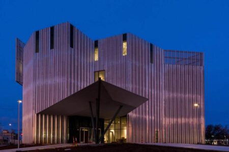 Del nuevo edificio —apodado Folding Light por sus creadores— destaca su fachada metálica compuesta por miles de aletas de aluminio, que recorren la altura de sus cuatro plantas. Estas piezas —con un acabado brillante que atenúa los reflejos en su superficie evitando una imagen puramente especular— se tiñen con la luz cambiante del cielo según las horas del día y los cambios meteorológicos. Este efecto se acentúa gracias a su colocación en nueve variaciones angulares diferentes, resultando en una arquitectura que, en palabras del propio Rand Elliott, «abraza la luz, atrapa la luz, y esa es la intención: que el edificio se convierta en parte de la atmósfera y del lugar».