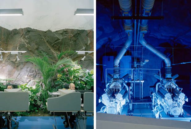 El lugar no da sensación de agobio pues cuenta con una superficie de 1.200 m2 repartidos en una nave central y cuatro alas salidas de un mismo núcleo. Y todo a treinta metros bajo tierra en un espacio concebido en la misma roca; una roca que en el proyecto fue considerada como un organismo vivo y no como un material de construcción. Los seres humanos son los que tratan de aclimatarse a la piedra mediante recursos como la luz, las plantas, el agua o la tecnología. Por ejemplo, la iluminación es el soporte artificial que se ha tratado con el mayor cuidado, pues resulta fundamental a la hora de recrear las variaciones producidas por el paso del tiempo en un área totalmente cerrada. La otra característica de este antiguo búnker es que ninguna de las estancias cuenta con una pared recta. De hecho, según el estudio, “la sala central no está limitada por superficies, sino que está definida por el vacío dentro de la masa”. En la sala acristalada y suspendida o en la zona de las máquinas de ventilación, todo tiene un aire de ciencia ficción resaltado por algunos detalles como las sillas One de Konstantin Grcic.