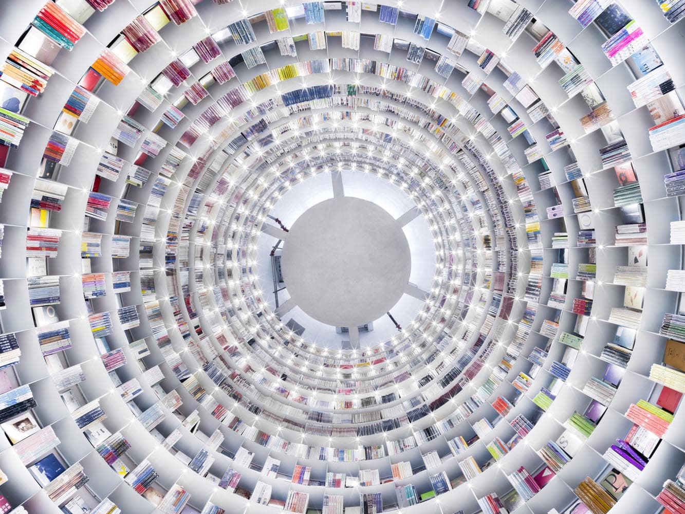 Esta arquitectura circular de perspectiva infinita se ve acentuada por la disposición en espiral de los estantes que, recorridos con la mirada del niño que entra en una tienda de juguetes, nos hacen sentir en el paraíso de la palabra.