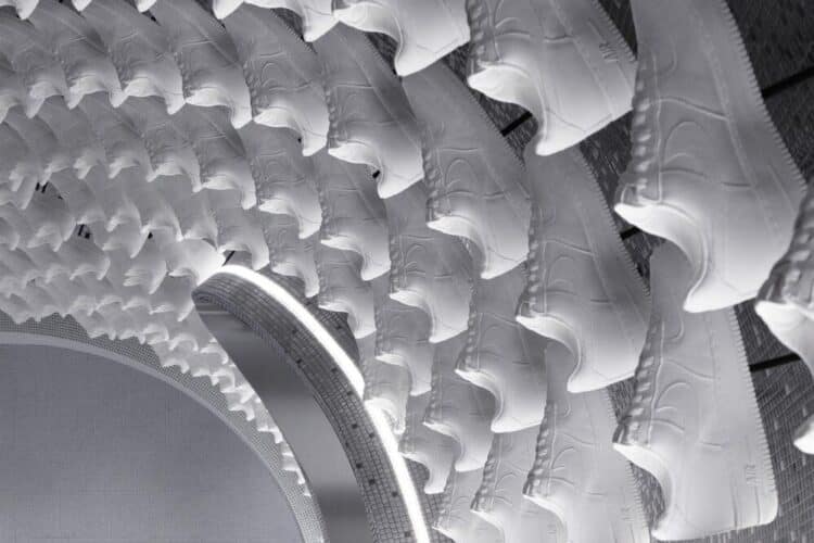 Destaca el uso de mármol de Carrara, acero inoxidable y vidrio, junto con una impresionante instalación en el techo que utiliza moldes de zapatillas Air Force 1 para crear un patrón rítmico y escultural característico de Snarkitecture.
