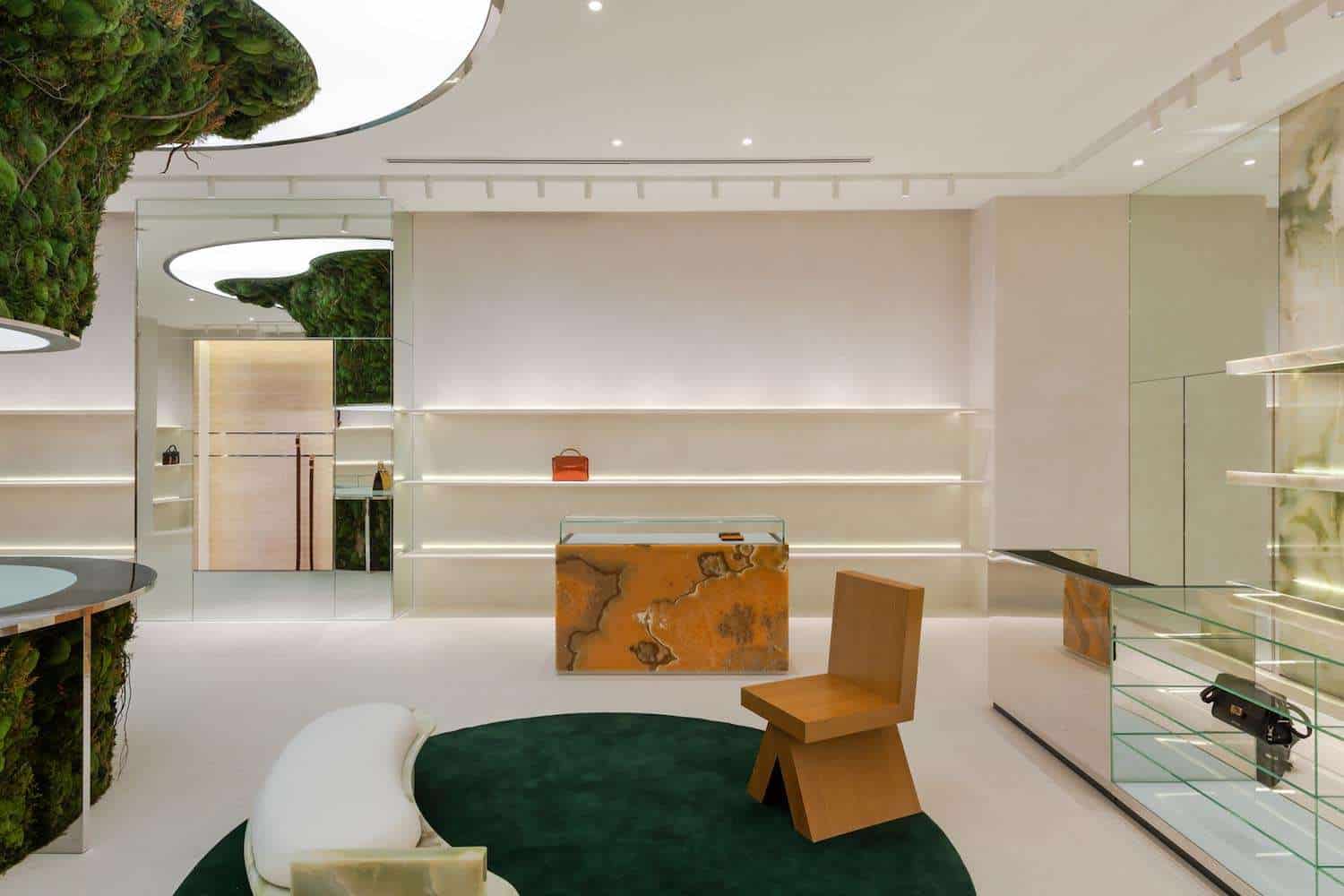 A nivel compositivo, el local se completa con un fondo neutro de paramentos de yeso blanco, una selección de superficies hechas con piedras preciosas como el ónix —que funcionan de expositores— y el vidrio en forma de vitrina. El resultado: una paleta cromática donde los complementos de piel resaltan sobre el resto de las tonalidades.