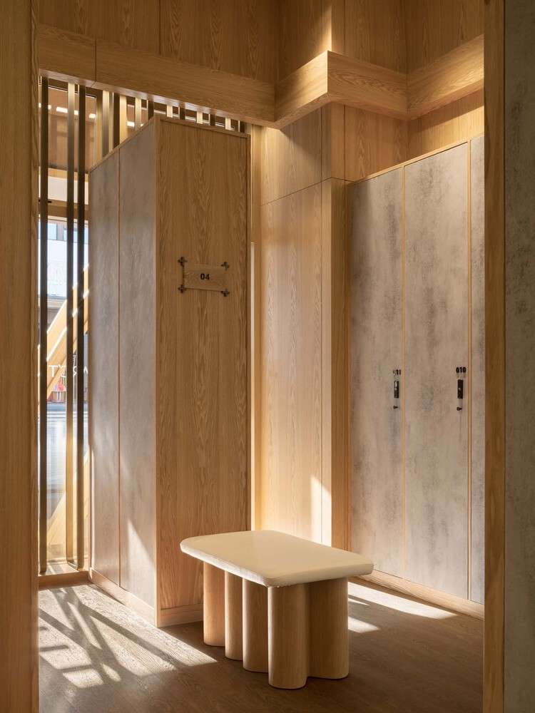 Aunque el inmueble surge de la planta baja de otro edificio de varios pisos, aparenta ser una entidad separada de él por su fachada sobresaliente. Y es que la atmósfera de tonos cálidos enfatiza la experiencia tanto en el exterior como en el interior. Con un revestimiento de madera clara y bronceada, ejerce un efectivo e inmediato contraste visual con el entorno frío. Además, la iluminación amarilla baña el local con un brillo acogedor que emana hacia el paisaje.