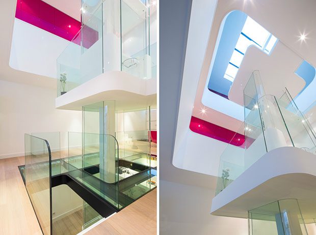 Un gran atrio servido como eje central atraviesa la casa y permite interactuar con las diferentes estancias. La fluidez en la comunicación viene definida por las inmensas particiones de cristal, por la transparencia y la luz que invade cada rincón y por el trazo de escaleras en Corian muy alejado del concepto tradicional. Aquí el hueco lo hace la propia escalera y la visualización del entorno se hace tanto en sentido horizontal como vertical. Algo así como una versión 2.0 y unifamiliar de las corralas madrileñas reflejadas en las obras de Pérez Galdós.